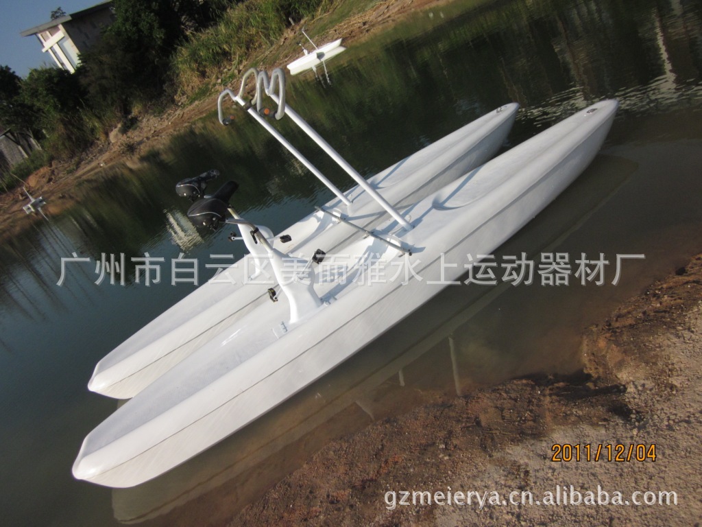 玻璃钢船体,既轻便强度又高,耐腐蚀,耐老化,表面采用进口玻璃钢彩色树脂胶衣,耐水耐老化,色泽鲜艳光洁;改进后的驱动系统采用蘸火伞形齿轮传动,速比(3:1)高,人力脚踏省力、速度还大大提高,极具健身锻炼和休闲娱乐性。