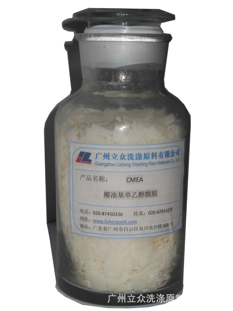 广州立众洗涤原料有限公司专业生产非离子表面活性剂CMEA,椰油基单乙醇酰胺,CMEA是采用精炼椰子油经甲酯化后,与单乙醇胺反应得到的产品,具有比6501更为突出的增稠作用和优良的增泡性。可与各种表面活性剂配伍,同时具有一定的调理作用和稳定香精的作用。广泛应用于香波、沐浴露、香皂等产品,具有优良的润肤、留香、去污和耐硬水性,生物降解率达7%以上。广州立众洗涤原料有限公司CMEA的产品是广东最大,质量最好的。