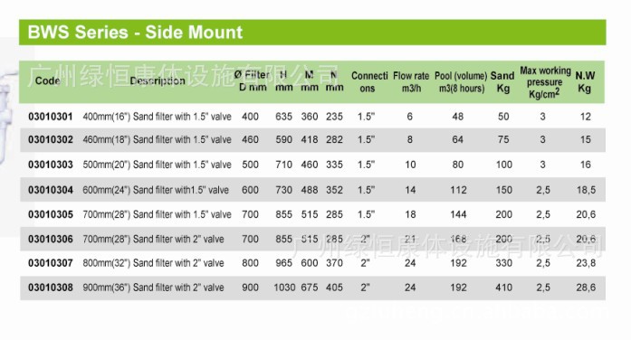 1、Well recognized b its strength and reliability with advance technology and machineries. 2、The filter tank made kt an inner fiberglass bladder to resist implosion ans high perssure capability with a gel coat layer to avoid capillarity. 3、All components injection molded from high strength engineering plastic 4、Available from 400mm/16"up to 900mm/36" 5、Lnner component materials made latest generation plastic resins. 6、 The multiport valve fixed with a clamp system that is easy to remove and quickly locks in place. 7、 The maximum worhing pressure as 2,5kg/cm2. 8、Sand filters provided with valve for models using 1,5"and 2" connections. | 1、它的力量和公认b领先的技术和机械可靠性。 2、滤槽的一种内在的玻璃纤维作kt膀胱破裂俺们高抵抗能力,附有一个胶壳层,以避免毛细现象。 3、所有部件注塑的都是高强度工程塑料。 4、可以从400毫米/ 16 " 900毫米/ 36条"。 5、零件材料最新一代的风景线了树脂胶。 6、一种多阀门的固定夹具系统,很容易去除,并迅速锁在的地方。 7、最大的worhing压力和2、5公斤/平方厘米 8、沙子过滤器提供阀门类型使用1、5”和2”连接。 |