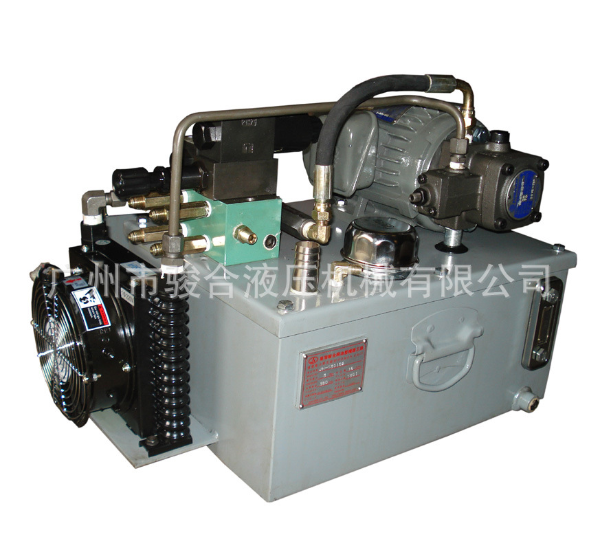 电机带动油泵转动,泵从油箱中吸油供油,将机械能转化为液压站的压力能,液压油通过集成块(或阀组合)实现了方向、压力、流量调节后经外接管路并至液压机械的油缸或油马达中,从而控制液动机方向的变换、力量的大小及速度的快慢,推动各种液压机械做功。