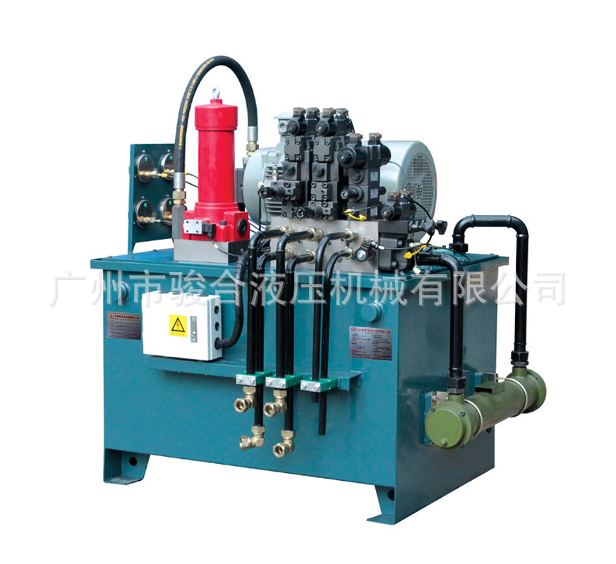 电机带动油泵转动,泵从油箱中吸油供油,将机械能转化为液压站的压力能,液压油通过集成块(或阀组合)实现了方向、压力、流量调节后经外接管路并至液压机械的油缸或油马达中,从而控制液动机方向的变换、力量的大小及速度的快慢,推动各种液压机械做功。