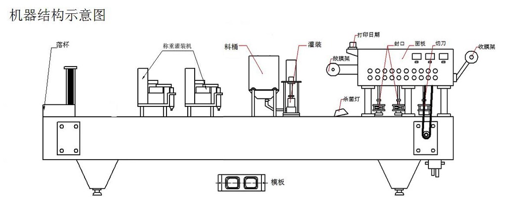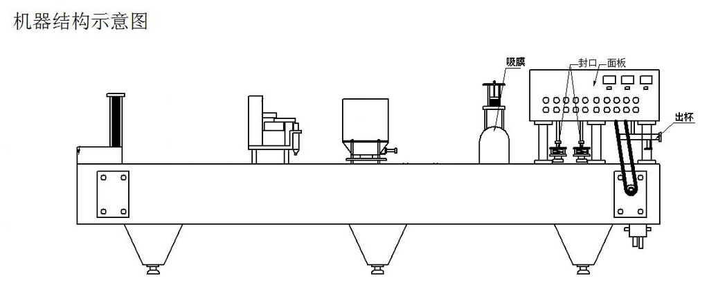 主要技术参数 产量 | 4000杯/小时 | 容量 | 150ml~450ml | 功率 | 5 Kw | 耗气量 | 1.8m3/min | 电源 | ~220V 50Hz | 外型尺寸 | 4000mmX800mmX1650mm | 重量 | 900kg |