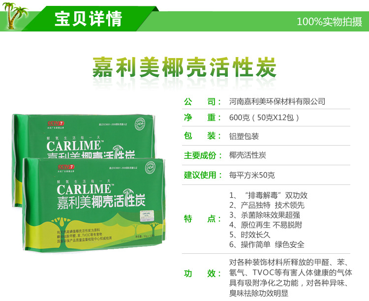 嘉利美《2013热卖》除甲醛家装椰壳活性炭600克 ,请详看下面的产品介绍,如果在拍的过程中有什么疑问,或者对活性炭、活性炭用法有什么不明白的,旺旺咨询或拔打电话:15981979539,随时为您答疑惑。