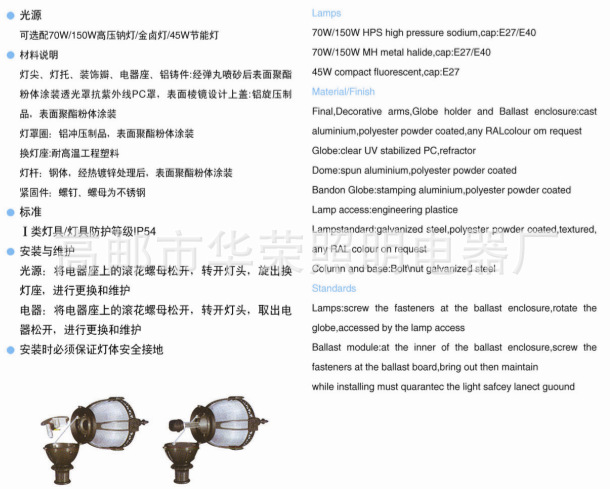 灯体:铸铝,表面喷进口聚脂塑粉,具有防紫外线和耐侯性佳的特性。