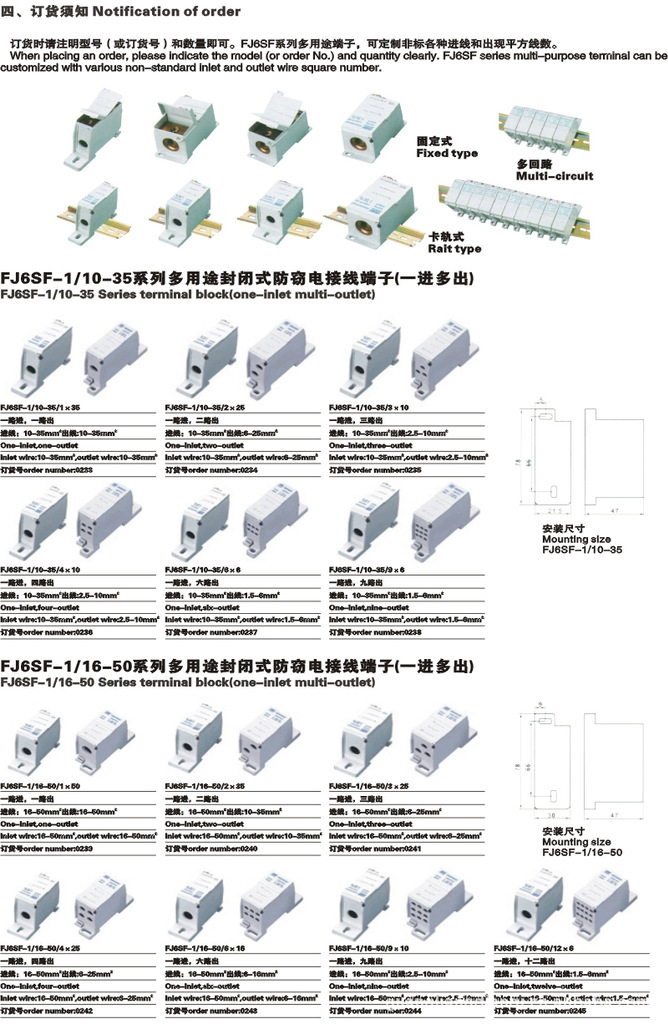 FJ6SF系列多用途封闭式防窃电接线端子由导体,且有封闭式绝缘座和防护罩组成,带有防盗窃左、右铅封装置,安装方便、构思精巧、外形美观、结构可靠。压线螺钉为高强度的紧定螺钉,底部为特制的球形,压线时对导线无损伤,而且对导线具有足够大的挤压力,接触更可靠。