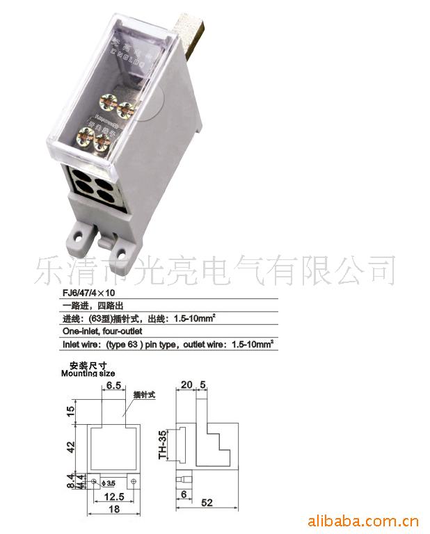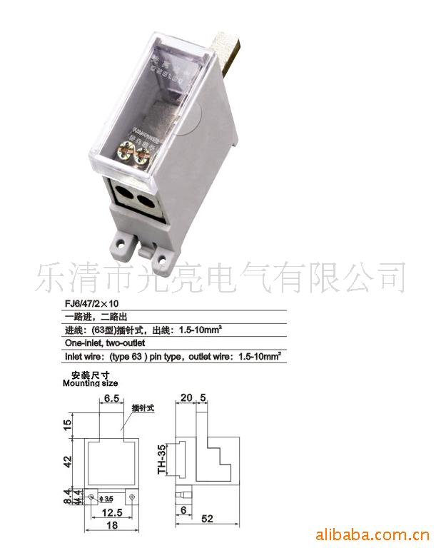 FJ6G、FJ6N、FJ6NB系列开关分线端子,专为各小型断路器、漏电开关断路器、塑壳开关、空气开关配套使用,用为电控设备成套装置及组合式终端电器箱中配线而设计,绝缘电压690V,额定工作电压380V,进线端直接紧配开关连接,无需其他导线、铜排、铝排、线鼻子过度连接,是目前断路器或漏电断路、出线端多路连接使用便捷、最牢固可靠安全的新颖产品。