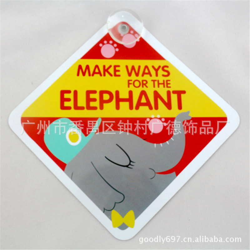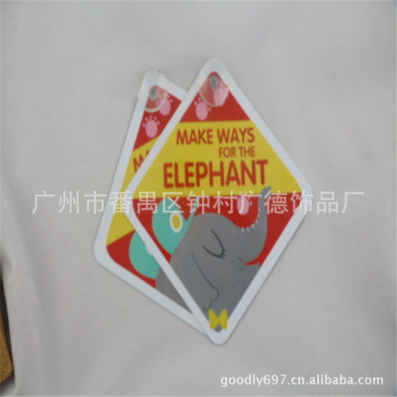 【特点】1.上面印刷提示语baby on board ,配上吸盘,可以牢牢挂在后窗玻璃上,起到提醒作用。