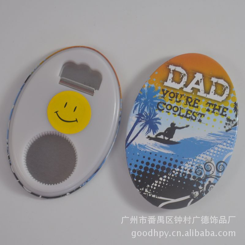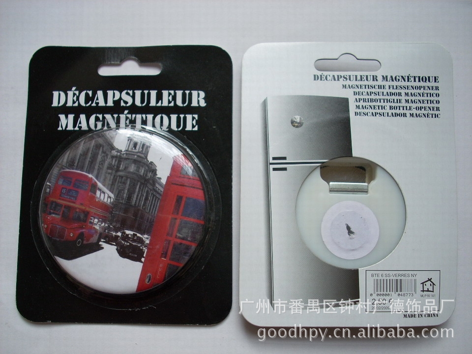 产品功能特色: | 1.经久耐用、美观大方、绿色环保、实用实惠、时尚耐用 2.通过EN71、SGS测试 3.用来开启啤酒瓶,用完后可贴在冰箱、微波炉、洗衣机等任何家用电器带铁的表面,起到装饰作用,使室内显得更温馨、舒适 4.同时也是一款实用且廉价的广告宣传促销馈赠品,其促销效果显著 |