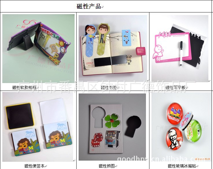 其他产品分类 Main products classification : | 磁性产品 | 1)磁性冰箱贴(Fridge Magnet) 2)磁性书签(Bookmark) 3)磁性留言板&笔(writing board&marker) 4)磁性拼图(Megnatic puzzle/jigsaw) 5)磁性智力板(Magnetic game board) 6)磁性便签本(Magnetic memo/note pad) 7)磁性电话本(Magnetic telephone book) 8)磁性相框(Magnetic photo frame) 9)磁性PVC相框(Magnetic PVC photo frame) 10)磁性冰箱贴&电子钟表(Fridge Magnet&clock) 11)磁性飞镖(Magnet dart board) | 软胶 PVC | 1)PVC软胶钥匙扣(soft PVC keychain) 2)PVC软胶钥匙扣相框(soft PVC photo keychain) 3)PVC软胶回形针(soft PVC paper clip) 4)PVC软胶手机座(soft PVC mobile holder) 5)PVC软胶冰箱贴(soft PVC fridge magnet) 6)PVC软胶杯垫(soft PVC coaster) 7)PVC软胶相框(soft PVC photo frame) 8)PVC软胶马克杯(soft PVC fridge magnet) 9)PVC软胶行李牌(soft PVC luggage tag) | PVC | PVC 1)PVC尺子(PVC ruler) 2)PVC手腕带(PVC wristbands) 3)PVC手机擦(PVC mobile cleaner/screen cleaner/mobilephone wiper) | 杯垫 | 1)中纤板杯垫(cork coaster) 2)灰板纸杯垫(carboard coaster) 3)吸水纸杯垫(absorbent coaster) 4)EVA杯垫(EVA coaster) 5)PVC软胶杯垫(soft PVC coaster) 6)纯软木杯垫 (cork coaster) 7)马口铁杯垫(tinplate coaster) 8)PP杯垫 (PPcoaster) 9)RS杯垫 ( RS coaster) 10)橡胶杯垫(rubber coaster) 11)亚克力杯垫(acrylic coater) 12)皮杯垫(leather coaster) | 鼠标垫 | 1)EVA鼠标垫(EVA mouse pad) 2)PP相框鼠标垫(PP mouse pad with photo frame) 3)布面橡胶鼠标垫(cloth rubber mouse pad) | EVA产品 | 1)EVA鼠标垫(EVA mouse pad) 2)EVA钥匙扣(EVA keychain) 3)EVA面具(EVA mask) 4)EVA帽子(EVA cap) | 马口铁产品 | 1)马口铁胸章/徽章(夹子/磁性)(Tinplate badge button/badge pin button) 2)马口铁镜子(Tin mirror) 3)马口铁开瓶器(Tin operner) | TIP,You can provide your creative design, in order to jointly study and manufacturing new products. |