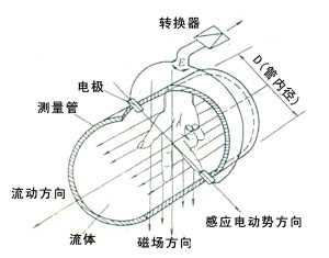VEC20系列电磁流量计的测量系统是是基于法拉第电磁感应定律,即导体在磁场中切割磁力线运动时在其两端产生感应电动势。如图所示,导电性液体在垂直于磁场的非磁性测量管内流动,与流动方向垂直的方向上产生与流量成比例的感应电势,电动势的方向按“弗来明右手规则”,