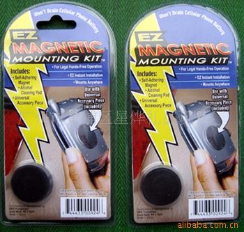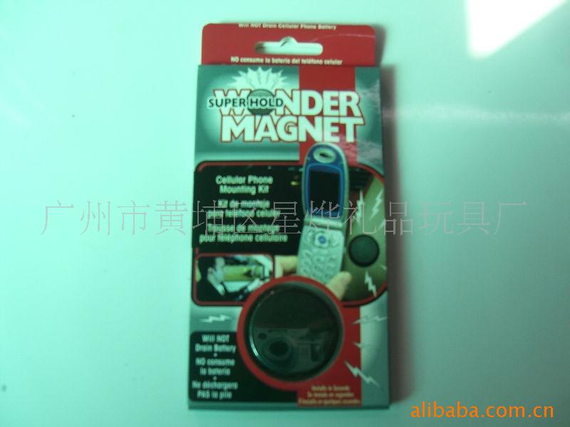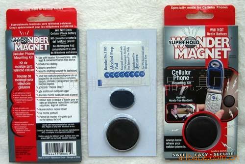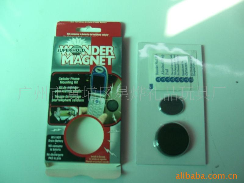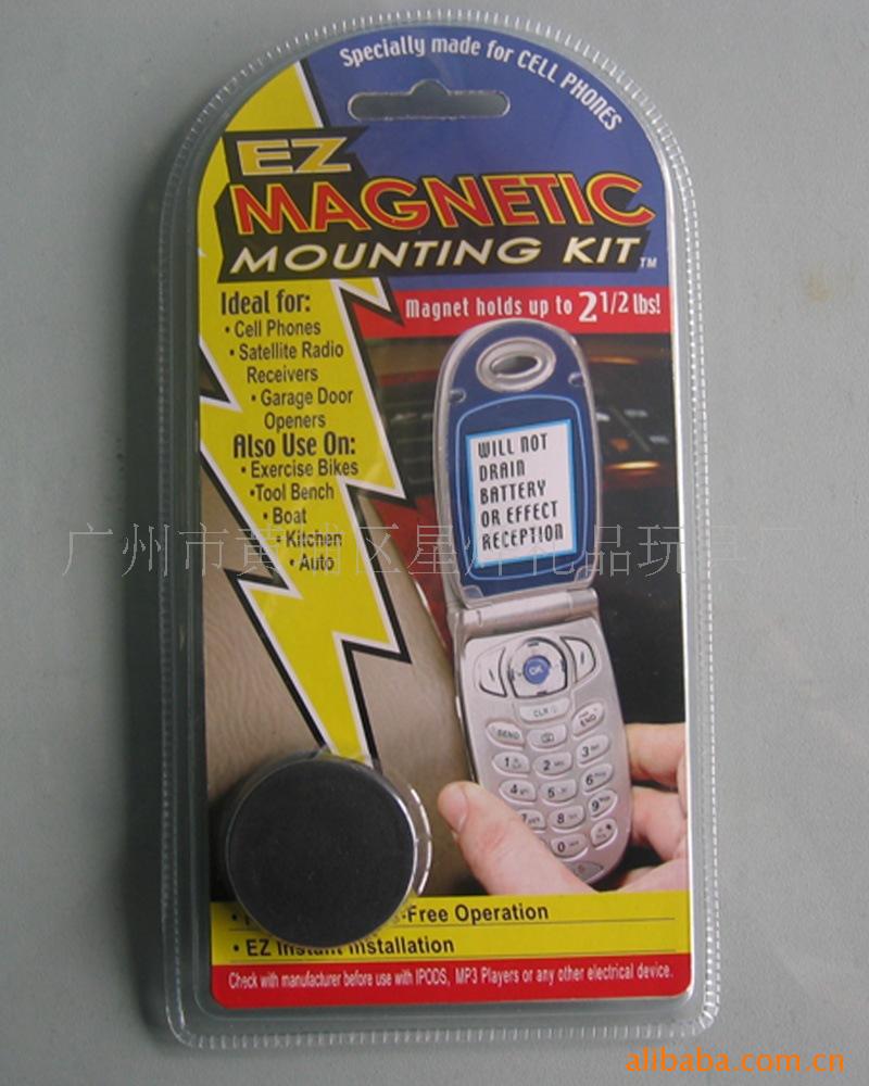 我司专业生产磁性制品。此样为磁性手机座。材质为塑料壳+海绵双面胶+磁铁+干燥剂。规格为直径40MM。彩盒加泡壳包装。