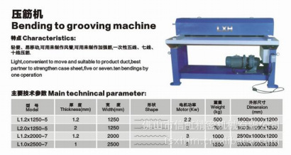 风管压筋机可分五线压筋机和七线压筋机,可压筋和交叉骨压筋。它具有重量轻,移动方便的特点,适用于通风管道工程的制作。五线平衡压筋机用于板料补强,可一次性压出多条加强筋,多用在冷气风管制作箱板料的加强等方面。