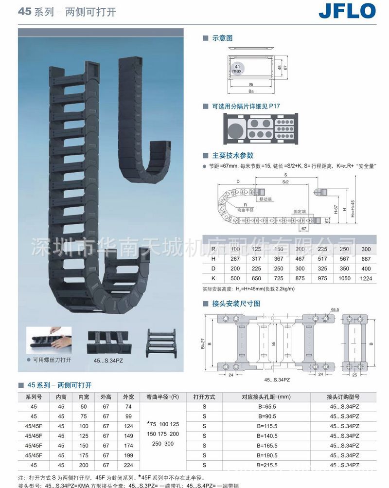 JFLO45R150坦克链 内宽125MM桥式坦克链 金福隆坦克链生产厂家深圳华南天城大量库存供应,拍后24小时内可发货。价格实惠,质量保证,一年包换,欢迎购买【为了避免误会拍后请亲再备注下发货参数:内高*内宽*长度*弯曲半径-打开方式本拖链单价以米为单位并含接头长度,如需更多配套接头请另拍,也可根据需要接成客人需要的长度】JFLO45*125坦克链参数