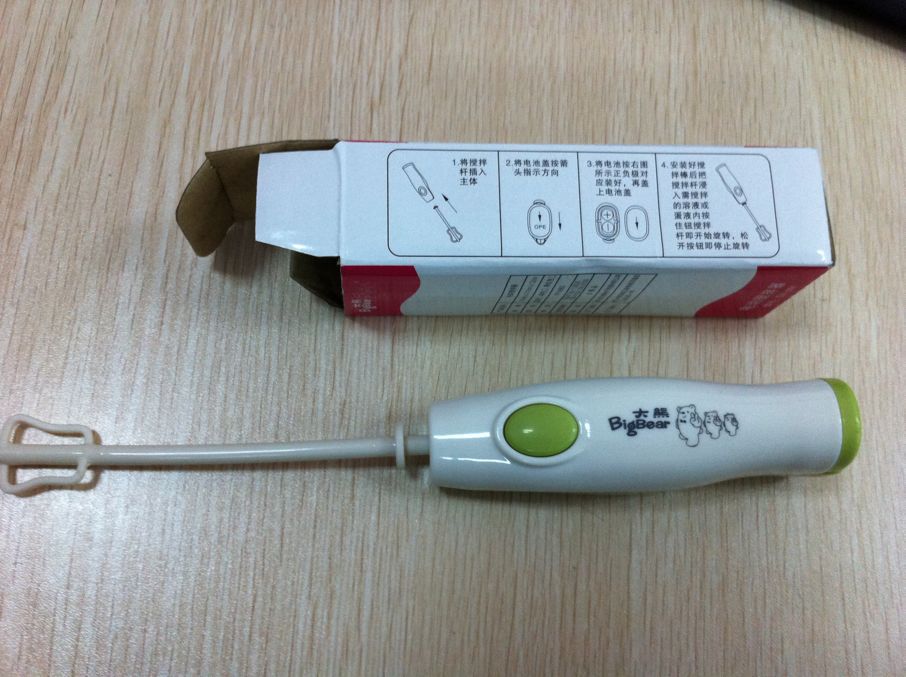 【产品特点】此搅拌器非常适合于搅拌婴儿粉状食品,大小正好适用于奶瓶,搅拌出来不留任何粉状块。这种便携式搅拌器使用和清洗都很方便,搅拌器的搅拌棒可以替换使用,需要有两节"AA"碱性电池驱动。⊙ 使用方便⊙ 容易清洗⊙ 使用于任何奶瓶【使用方法】使用前:握住手柄,手柄处用干净的湿布擦干净,滑动开关,打开放电池的翻盖,放入电池盖上翻盖。搅 拌:把事先测量好的水倒入容器,加上需搅拌食物,然后打开开关,开始搅拌。当容器转动时勿接触搅拌筒,在搅拌筒停止转动前不要将它提出水面。清 洗:把搅拌筒轻轻提出,浸泡在热水里,用干净的布擦洗,然后自然风干。不要浸泡在凉水里,也不能放入洗碗柜里清洗,