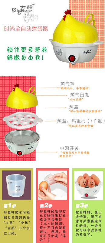 本机可通过加不同的水量而煮出5分熟、7分熟、全熟等多种不同口味的蛋。