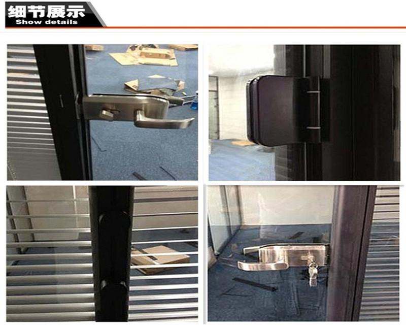 6、隔断配套门、锁样式灵活:可以与有框玻璃门、无框玻璃门、实木门配套使用,并可以做成单开或双开门;门锁的选择有压把式或其他多种样式
