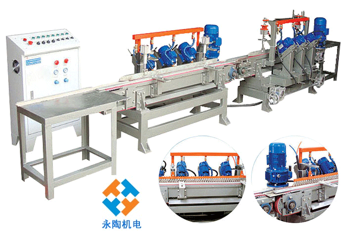 性能特点:该机采用三个倒角磨头为一组同倒一条边;四条边分四组磨头连续分别倒角。性能稳定、速度快、角度一致。