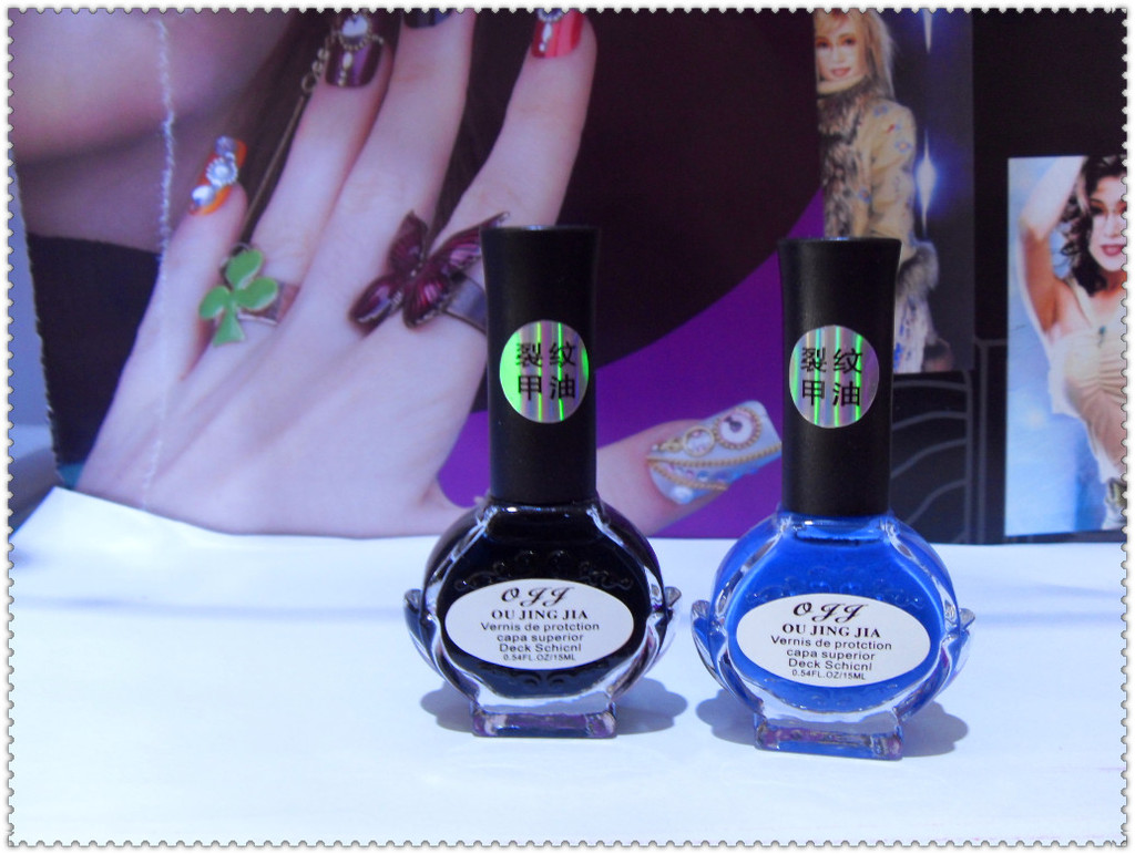 先涂一层白色的指甲油打底,等白色指甲油干掉后再涂这种冰裂的指甲油,等干了,神奇的效果就产生喽,裂缝的大小完全取决于涂的甲油的厚薄哦,所以一切都可以由你控制哦!想要大一点的裂痕那就涂厚一点,想要文气点细细的裂痕,那就涂薄一点,底色也可以自己控制哦,不想涂底色甲油的,涂一点护甲底油也可以哦,全部干了后再涂一层亮油,不同方法不同效果!美美的指甲不一定要去美甲店花大价钱哦!