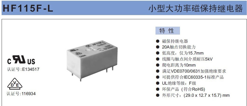宏发继电器 HF115F-L,双线圈磁保持继电器,20A继电器