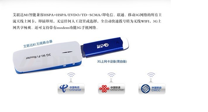 通过外置3G上网卡接入,提供多用户共享3G移动网络。
