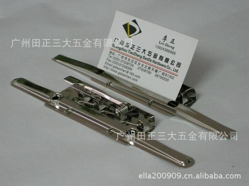 “田正”生产:五金夹,文具夹,小夹子,厂牌夹,鳄鱼夹,窗帘夹,蝴蝶夹,板夹,强力夹,联系:张小姐13922978891笔记本锁,锁夹,名片夹,挂历夹,塑料孔夹,塑料蛇夹,台历圈,活页环,大蛇夹,五金配件,文具配件,挂历配件,五金文具夹,账钉,YO线圈,蛇仔圈。五金文具夹有2孔至30孔,有圆形圈,D形圈,方形圈(Q形)。长度分别有123.133.152.190.210.260.280.290.310(MM)。圈内径最小为15MM,最大为78MM。账钉的长度可按客户要求订做,材料有铜,铁,铝。可电镀各种颜色。