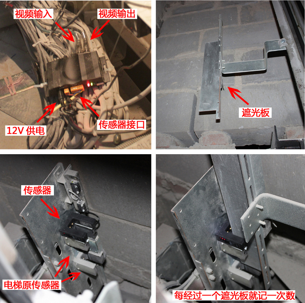 电梯楼层显示器安装方法:将传感器安装在电梯轿厢顶部遮光板两侧,主机安装在轿厢顶部,摄像机输出的视频线连接主机视频输入,随行线缆连接主机视频输出即可,无需改变原视频线路。