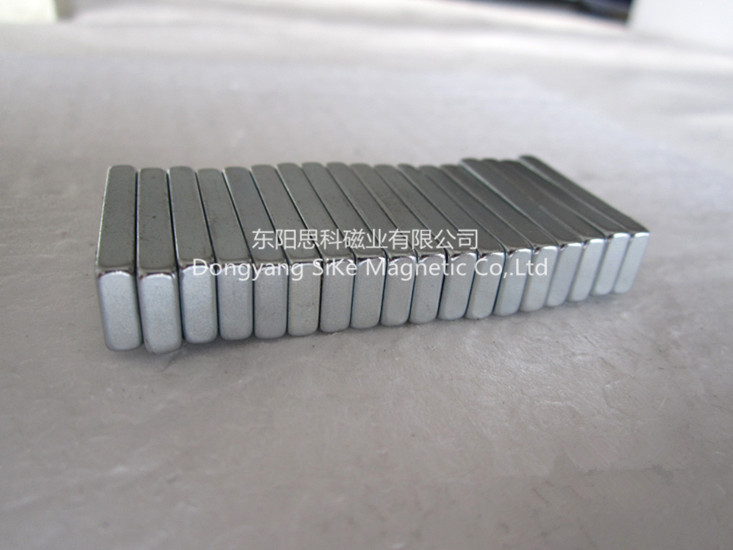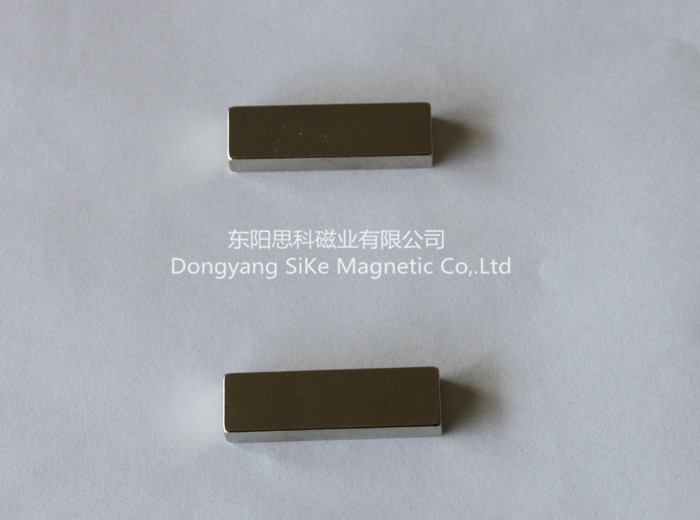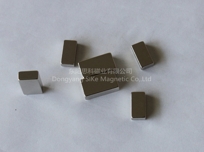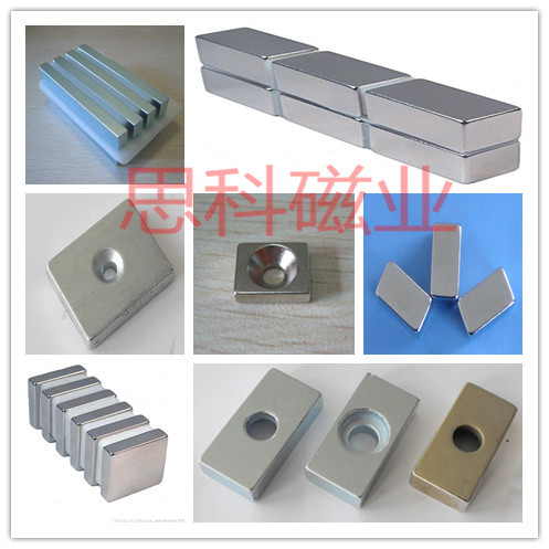 烧结钕铁硼永磁材料是以钕(Nd)32%、铁(Fe)64%、硼(B)1%等为基本原材料,少量添加其它稀土元素,牌号有N35-N52各种,形状可按具体要求加工成各种各样:磁片(块),磁环,磁棒,凸型,开槽。尽管有这些优点,但是表面容易生锈,所以通常需要作一些保护性表面处理:镀镍,镀锌,,镀金,镀黑锌,镀黑镍等。通常钕铁硼的适用的环境温度是200度以下,主要应用于电子、电器、包装、电机、玩具、皮具、汽车机械等。