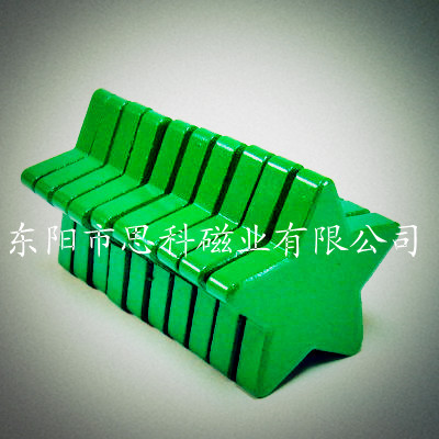 烧结钕铁硼永磁材料是以钕(Nd)32%、铁(Fe)64%、硼(B)1%等为基本原材料,少量添加其它稀土元素,牌号有N35-N52各种,形状可按具体要求加工成各种各样:磁片(块),磁环,磁棒,凸型,开槽。尽管有这些优点,但是表面容易生锈,所以通常需要作一些保护性表面处理:镀镍,镀锌,,镀金,镀黑锌,镀黑镍等。通常钕铁硼的适用的环境温度是200度以下,主要应用于电子、电器、包装、电机、玩具、皮具、汽车机械等。