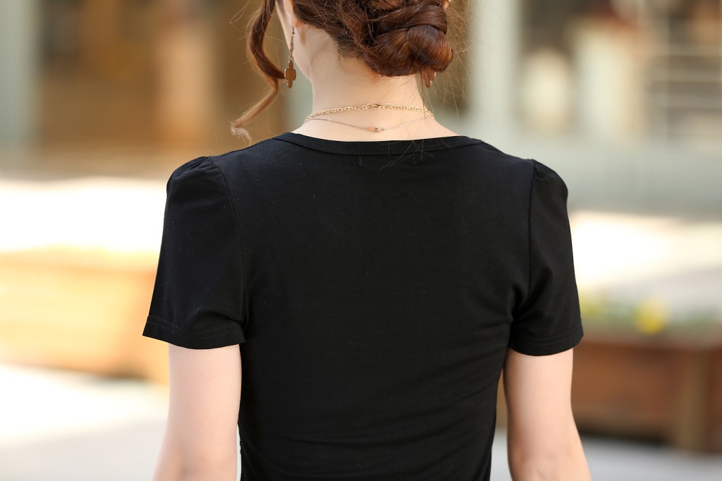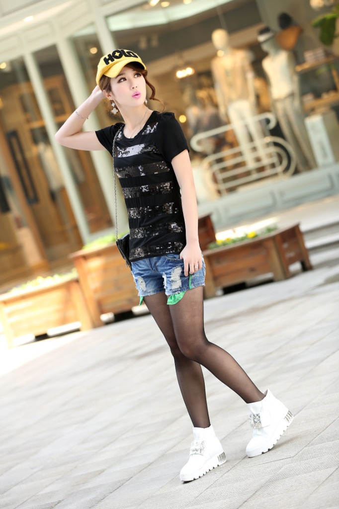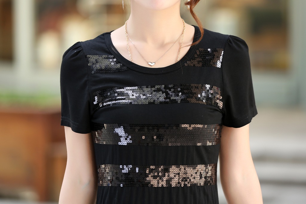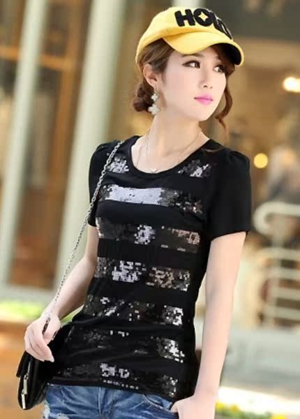 韩版简洁休闲亮片T恤,手感柔软舒适,做工精细,上身也超美,非常适合夏季穿。亮片设计、处处细节都简约得当。百搭又有特点。简单一件上身,就绝对不会出错啦!
