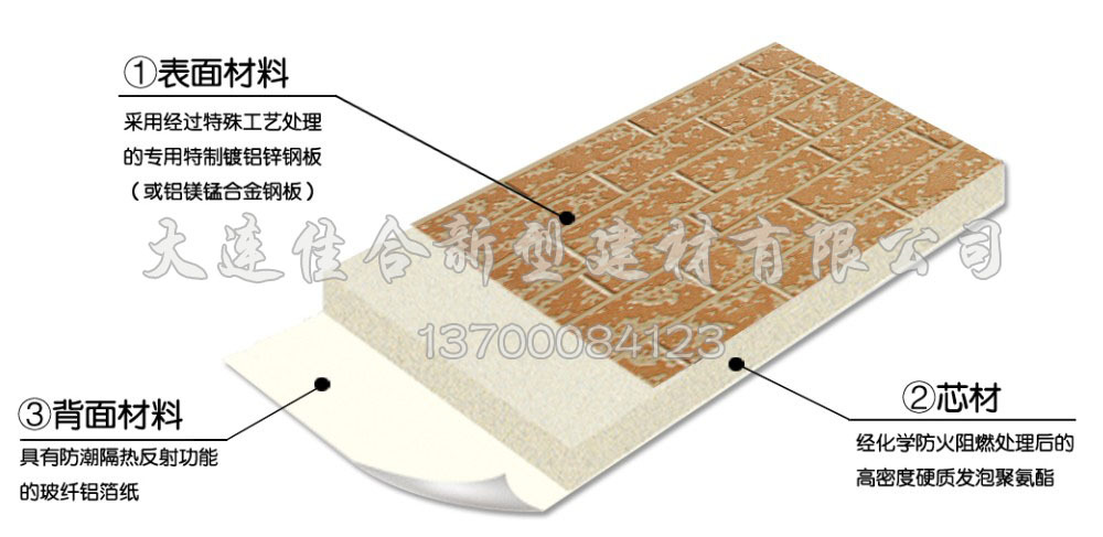 2.中间保温层采用高密度硬质发泡聚氨酯是目前国际上技术最先进,最符合环保要求的保温材料,同时经测试,硬质聚氨酯泡沫在高温下使用25年后,其保温性能下降不到3%,再加上背面用铝箔纸精密结合的保护作用,更加有效的保证了佳合板墙体节能系统在各种环境条件下均能长期保持稳定良好的保温节能效果。