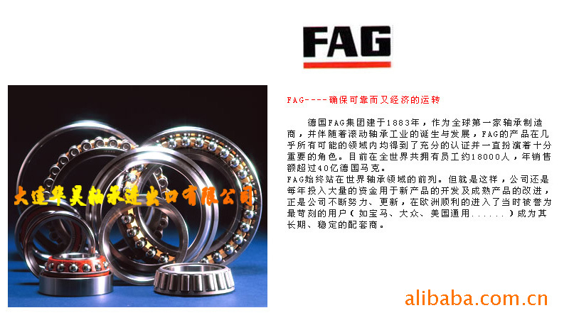 FAG(中文译名:富爱其)自1883 年德国的 Fischer 先生发明了磨制钢球的球磨机并创建 FAG 公司以来,伴随着滚动轴承工业的诞生和发展,FAG轴承 的产品在几乎所有可能的领域内均得到了充分的认证并一直扮演着十分重要的角色。
