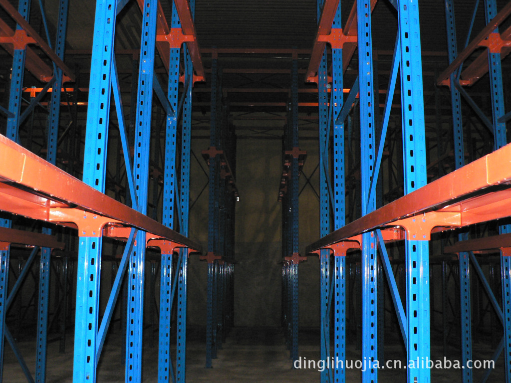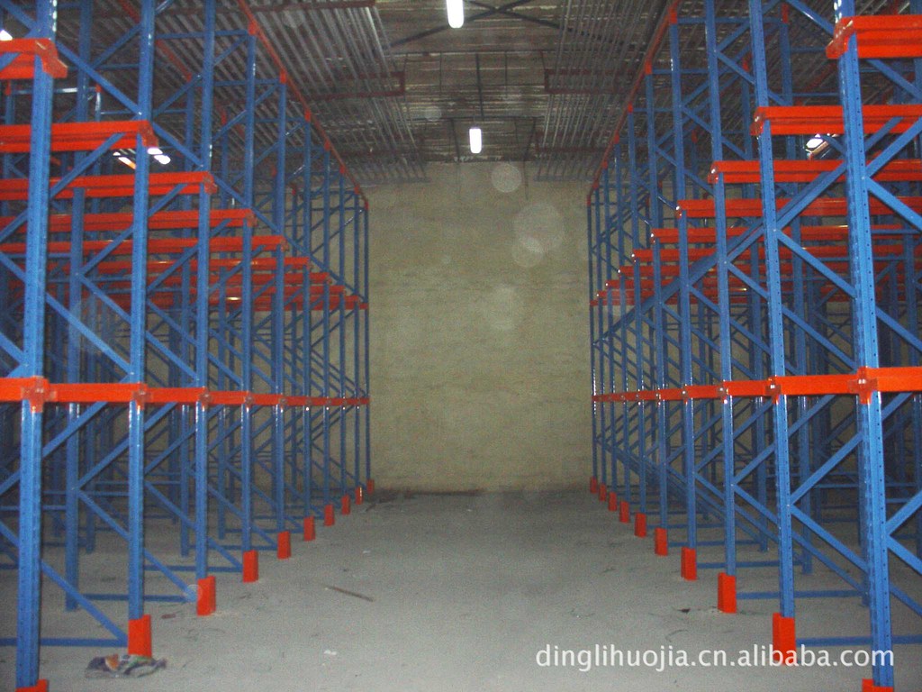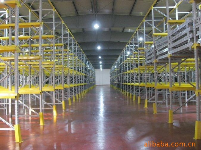 贯通式货架:贯通式货架又称驶入式货架;是采用托盘存取模式,该货架系统所占用的空间非常小,但能提供最大的仓储容量。贯通式货架系统由连续的货架操作巷道构成,仅设有一条装载和补充货物的主通道,可以通过平衡重式叉车和前移式叉车自由的进出于货架之间的巷道,进行装载和卸载货物,货架在操作时遵循“先进后出”[FILO]原则操作。也可支持“先进先出”[FIFO]原则操作,货物从一侧存入,从另一侧取出。贯通式货架系统适用于品种少,大批量的货物储存类型,被广泛应用于冷库、乳业、饮料及食品、烟草行业等库房。