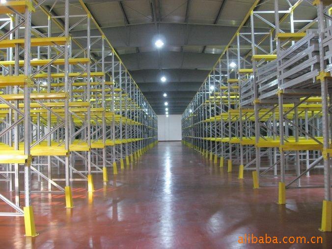 贯通式货架:贯通式货架又称驶入式货架;是采用托盘存取模式,该货架系统所占用的空间非常小,但能提供最大的仓储容量。贯通式货架系统由连续的货架操作巷道构成,仅设有一条装载和补充货物的主通道,可以通过平衡重式叉车和前移式叉车自由的进出于货架之间的巷道,进行装载和卸载货物,货架在操作时遵循“先进后出”[FILO]原则操作。也可支持“先进先出”[FIFO]原则操作,货物从一侧存入,从另一侧取出。贯通式货架系统适用于品种少,大批量的货物储存类型,被广泛应用于冷库、乳业、饮料及食品、烟草行业等库房。