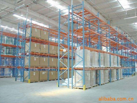 重型横梁式货架:又称货位式货架、托盘式货架、通常为重型货架,众所周知,在国内的各种仓储货架系统中使用最为广泛且最经济的托盘式货架系统。首先须进行集装单元化工作,即将货物包装及其重量等特性进行组盘,确定托盘的类型、规格、尺寸,以及单托载重量和堆高(单托货物重量一般在2000kg以内),然后由此确定单元货架的跨度、深度、层间距,根据仓库屋架下沿的有效高度和叉车的最大叉高决定货架的高度。