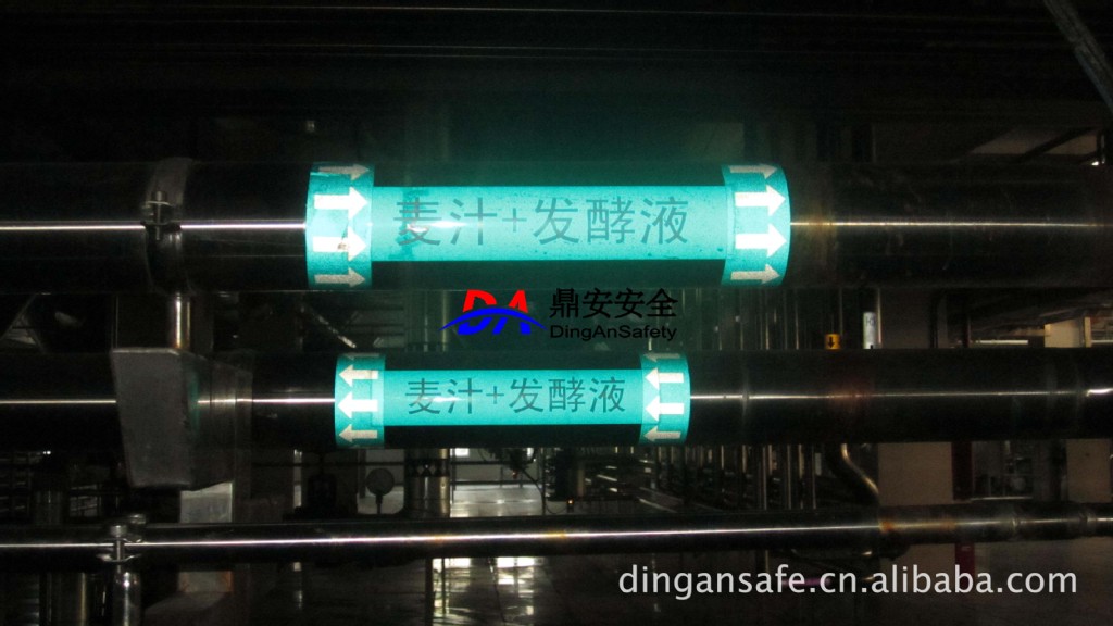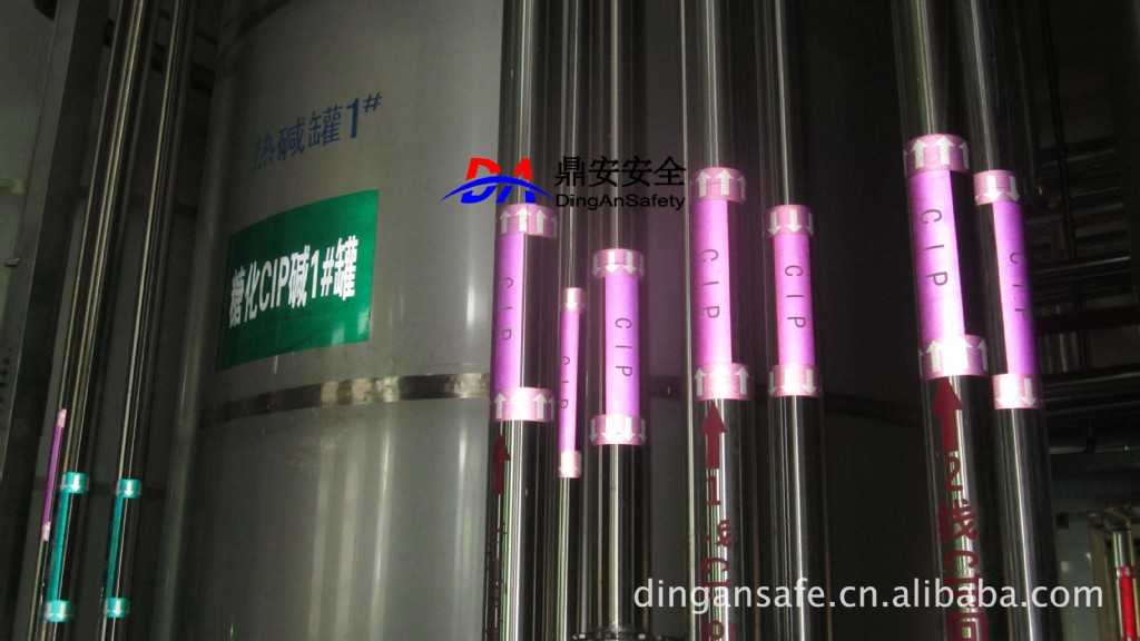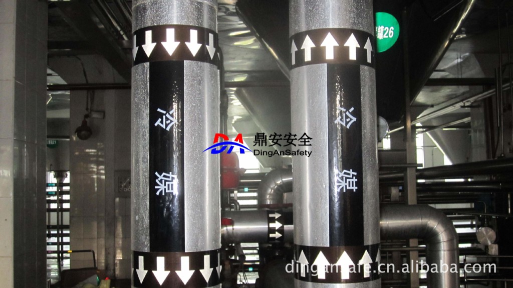 管道标识: 引进德国、加拿大、美国技术研制生产的工业管道标识产品,具有绿色环保、无色无味、美观、夜视效果对比度强、耐酸碱腐蚀、耐潮湿、耐高低温、不褪色、不掉 落、不剥落、安装简便、工程造价低等特点!其核心竞争力在于:具有反光功能、阻燃功能、使用寿命长、价格相比进口同级别产品极具竞争优势!鼎安管道标识解 决方案遵循中国国家标准或国际标准,特别是反光系列和阻燃系列已经得到了众多外资企业的高度认可。
