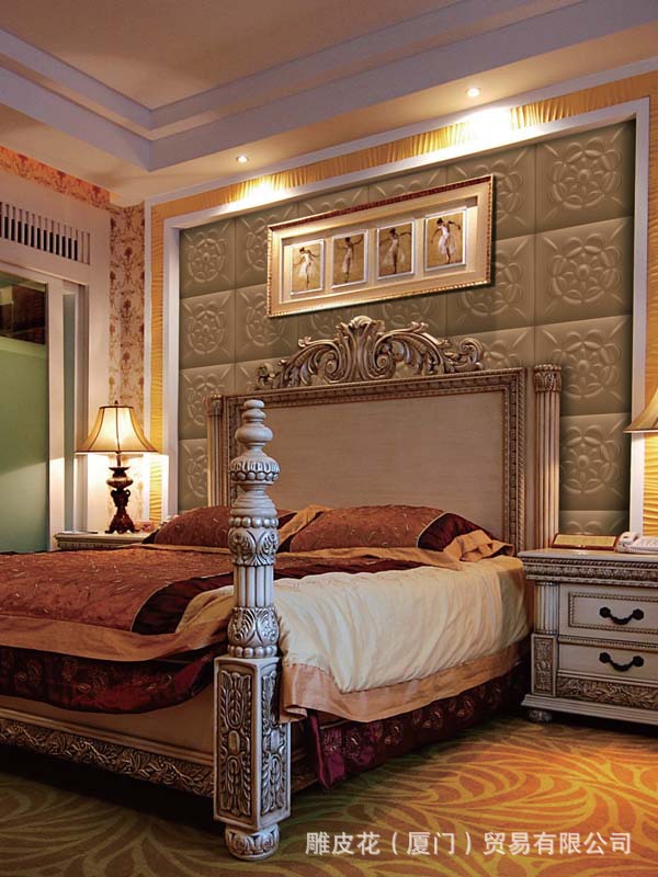 雕皮花3D软包是新型环保材料加工而成,无污染,无辐射;经过70道无毒测试完全合格。