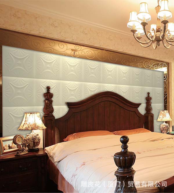 雕皮花3D软包是新型环保材料加工而成,无污染,无辐射;经过70道无毒测试完全合格。