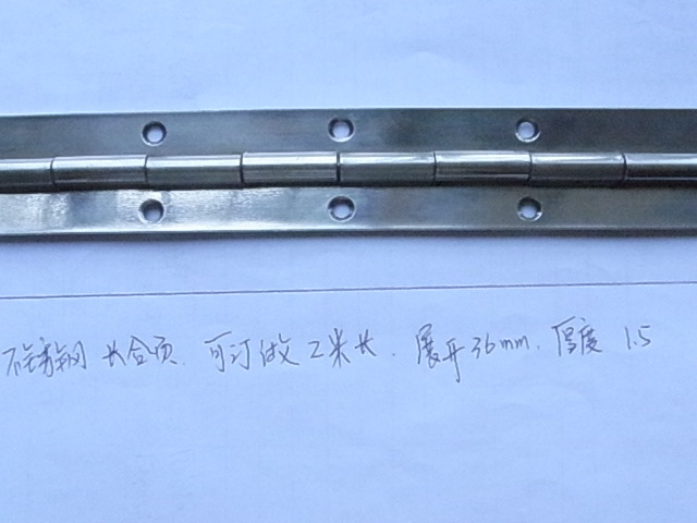 二,钢琴合页:钢琴合页长度可以做到200mm----3000mm,.厚度有0.5mm----3.0mm,宽度15mm----100mm,材质有:304#,201#,316#不锈钢,铜材,铝材,铁材等