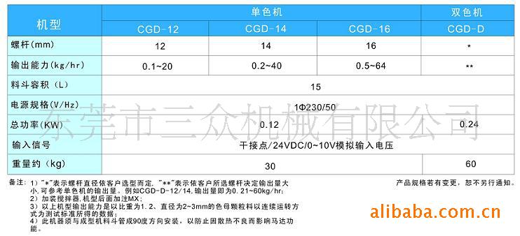 CGD系列称重式色母混合机,配置高精度称重传感器,可以对塑料原料的1种主料和1~2种色母料或添加剂按比例自动混配,适用于注塑、挤出或吹塑生产。该系列产品采用混合式步进电机驱动,并配合HMI一体式控制器,可精确地计量色母及添加剂的添加比例。此混合机可以与各类成型机信号做连接进而同步运转,保证成型产品性能一致性。螺杆直径区分为12,14,16mm三种,可提供每小时0.05到64公斤的不同输出量供客户选择。另有双色色母机,可依客户需求搭配任意两台色母机合并使用。