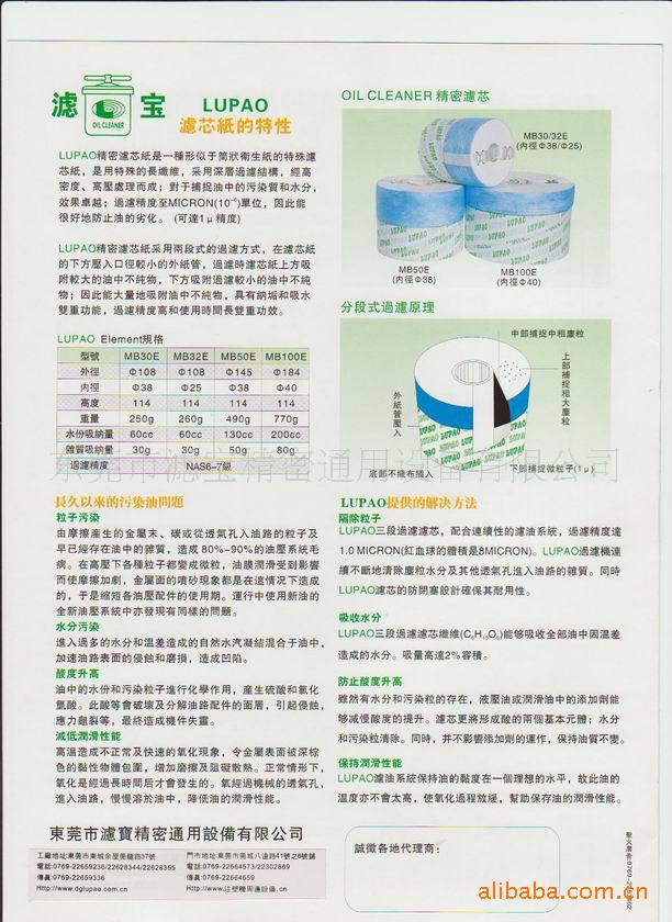 6.更换作业方便为达上述性能要求我们长期研究开发完成了高性能的LUPAO滤芯,我们采用了高吸附性和吸水性强的纤维为原料,以卷筒方式制成一定密度的基材,再把它下部压入口径较小的外纸管内,使滤芯本身产生不同密度的梯层,如此,可使过滤的精度用污染物捕捉能力大为提高.