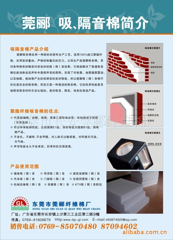 莞郦纤维棉厂生产:防火棉、吸音棉、吸音材料、喷胶棉等产品。