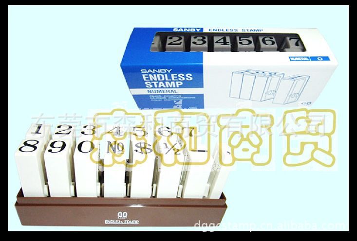 使用范围:中文“0-9”10个数字以及5个常用字符共计15枚为一套SANBY中文数字组合连接印章,英文“A-Z”26个字母以及4个常用字符共计30枚为一套SANBY英文字母组合连接印章。此套印广泛用于产品编号、包装条形码、食品袋以及其他产品外包装生产日期等作业印字。