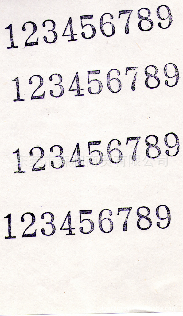1号英文/数字组合印章字高 8mm 2号英文/数字组合印章字高6.5mm 3号英文/数字组合印章字高5mm 4号英文/数字组合印章字高4mm 5号英文/数字组合印章字高3mm 6号英文/数字组合印章字高2.5mm