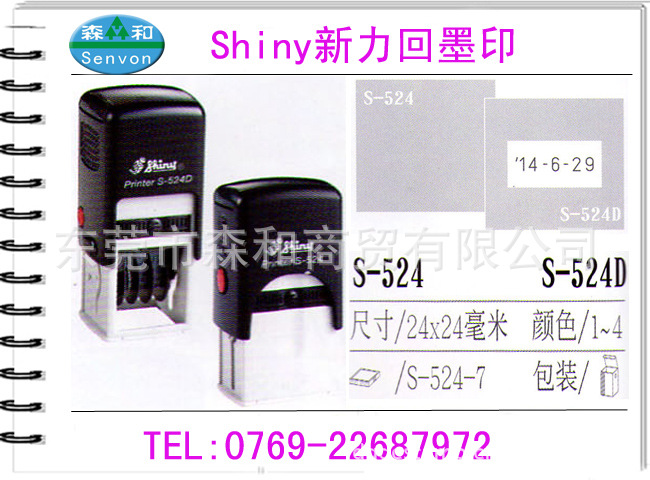 台湾shiny新力旗下款式多种,分别有:轻型回墨印,重型回墨印,随身印章,光敏印章,字粒回墨套印,回墨日期印,日期钢印,日期章,号码章,数字章,转动印章,回墨印油,光敏印油,原子印油,水性油墨,新力印台,毛毡印台,海绵印台,防伪指纹印台等等...
