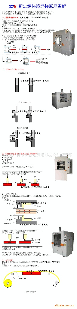 工作原理 热塑性材料在加热元件加热下,分子达到熔融状态,短时间内两塑件在一定压力下压合,相互间通过分子运动成为一体,并经一定时间冷却后,两塑件就会熔合为一体,并达到一定熔接强度,这样就实现了熔接功能。应用领域 塑料水箱、油壶、灯具、容器、车灯、汽车水箱、洗衣机出水栓、蓄电池、蒸汽烫斗、汽车塑料手套箱焊接机、蓄电池、车尾灯、仪表板、进气管、塑料卡板、洗衣机的洗衣鼓、洗碗碟机的水箱、蒸汽烫斗、足浴盆等等。