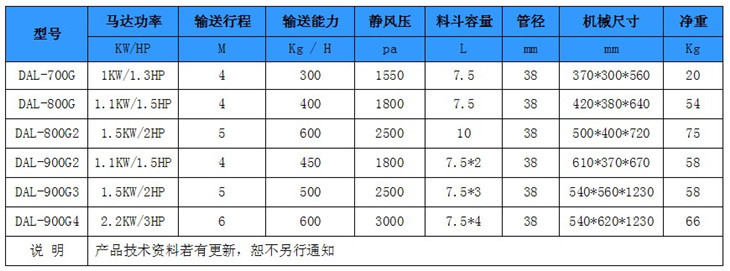 德力牌分体式真空填料机适用于长距离输送原料,主机与料斗分离的设计可满足客户使用需求。DAL-700G / 800G / 800G2适用于一台对一机组合,DAL--900G2/900G3/900G4适用于一台对二机组合。各机型均采用不锈钢料斗,确保原料不受污染,配有高效高压风机,兼具轻便耐用、吸力特强、安装简便、操作容易等特性。德力该系列产品具有功能强大,安全可靠等特点,是塑料行业及其它如食品,饲料等行业之必备自动化高效设备。