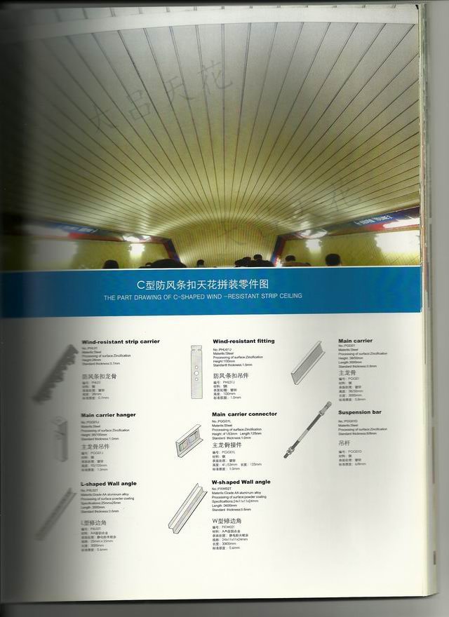 S高边防风扣板天花吊顶由装饰面板、条形扣板专用副龙骨以及上层轻钢主龙骨和相关配件共同构成。 装饰面板分为C型无缝条扣、G型有缝条扣、S型高边条扣、D型高边密缝条扣。条形扣板常用宽度有50mm、100mm、150mm、200mm、300mm、400mm。常用厚度分为0.5 mm-1.0扣板采用连续辊压成型,常规最大长度尺寸6000mm。表面涂层一般粉末静电喷涂或聚脂漆喷涂、辊涂,也可选用拉丝表面处理。 S高边防风扣广泛用于加油站,称之为加油站专用吊顶。