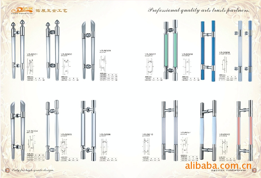 佑展工艺拉手厂专业生产各种高档豪华大拉手,不锈钢拉手,各种五金拉手,水晶拉手,仿古拉手,浮雕拉手,合金拉手,浴室小拉手等,各种电镀颜色的工艺都能达到客人的要求,各种工艺的五金造型只要能提供cad或施工效果图,我们依图加工出的工艺拉手都能让您满意!我厂是一家集设计、生产、销售和服务为一体的专业厂家。产品种类繁多,款式豪华典雅,工艺精细,畅销欧洲、东南亚及国内大型建材市场,在业内拥有良好口碑,在市场深受消费者青睐。