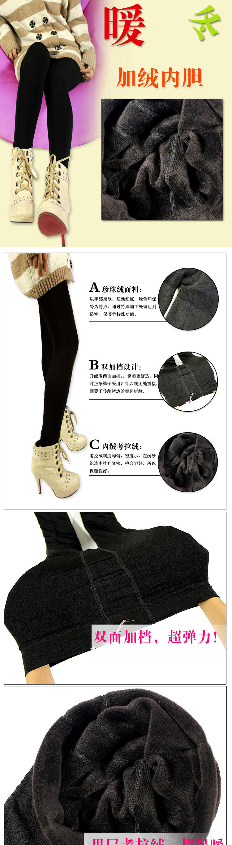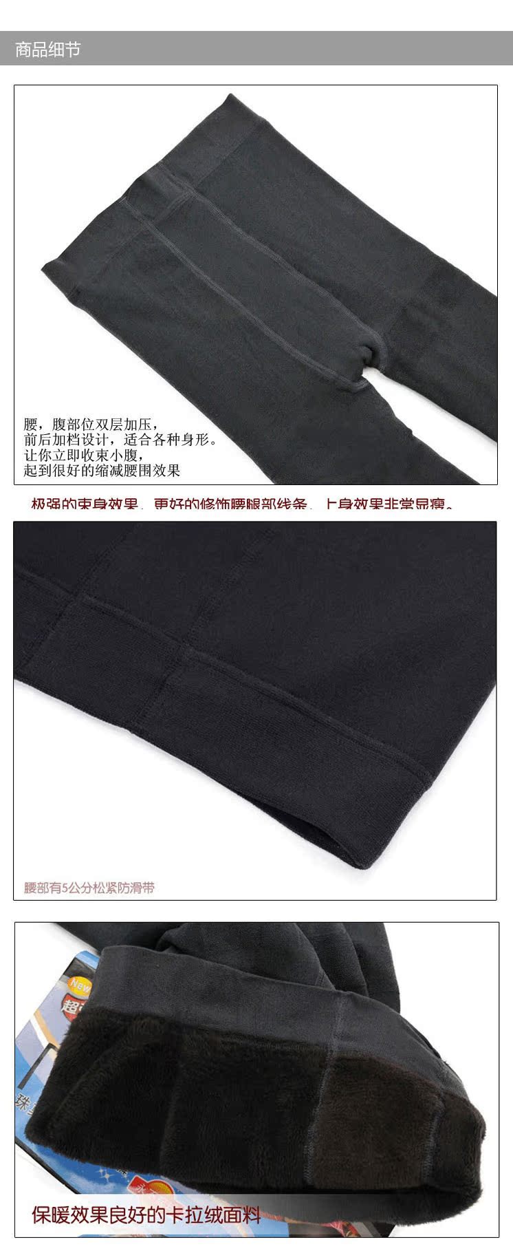 【宝贝名称】珍珠不倒绒保暖裤【颜色选择】黑色、灰色、咖啡色【面料材质】珍珠绒+不倒绒【尺寸详情】均码 裤长:90CM 臀围:85-115CM 适合身高155-170CM 的MM~【宝贝描述】加厚内胆是不倒绒的哦,舒适保暖,显瘦百搭哦