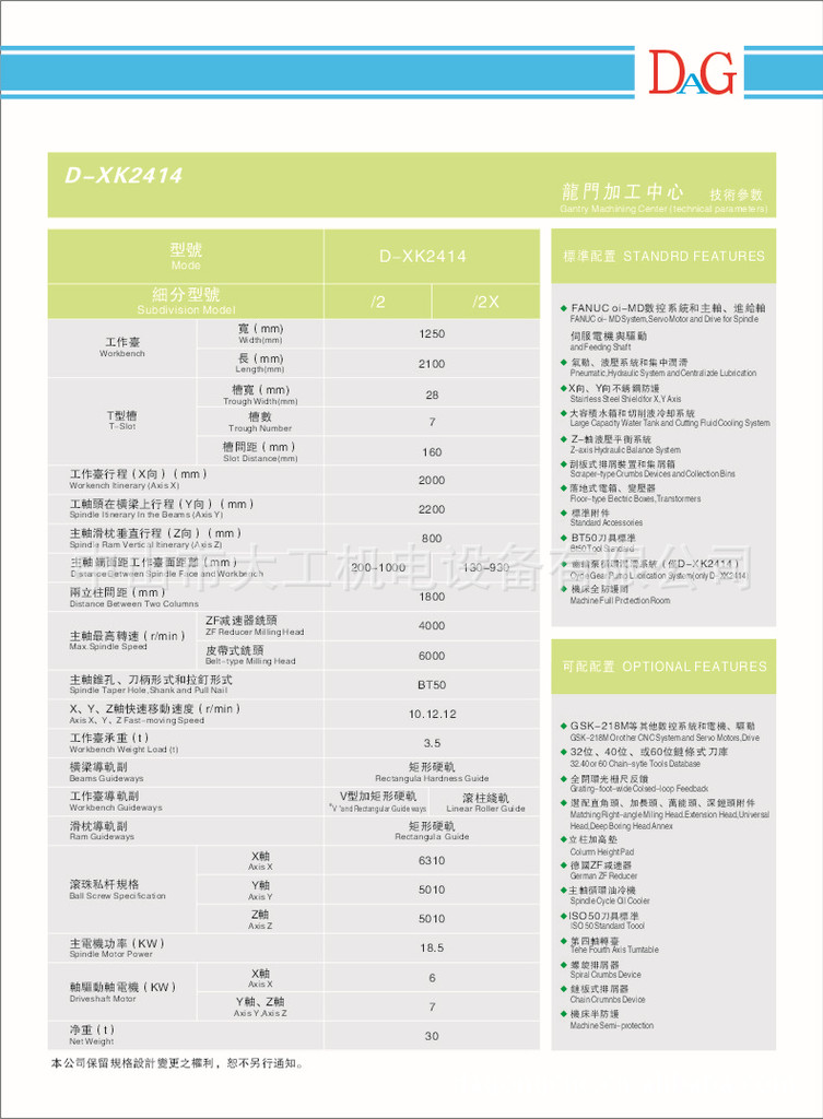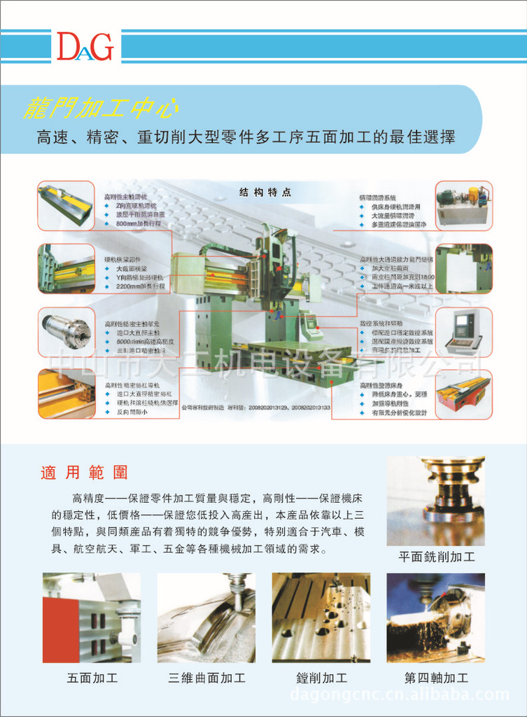 中山市大工机电设备有限公司成立于2002年,是一家数控机床和行业配件的台商合资企业,目前投放市场的产品主要有数控机床(加工中心,雕铣机,深孔钻,高速钻孔攻牙铣一体机,数控车床等);DAG系列工业冷却设备(主轴油冷机,水冷机);空气干燥净化设备(空气干燥机);数控机床配件电子手轮和手轮配件如编码器、波段开关、数字式波段开关、弹簧线及数控I/O线缆等,其中电子手轮可适用于发那科、西门子、三菱、发格、海德汉、宝元、新代、海那克HANUC、广州数控GSK、开通数控、凯恩帝KND等知名数控系统及符合下列条件范围内的所有数控系统(输出脉波100PPR或25PPR,供电范围在DC5V-24V之间)。大工机电设备有限公司本着“客户第一,诚信至上”的原则与多家企业建立了长期合作关系,热诚欢迎各界朋友前来参观,考察,洽谈业务。详情请登http://www.dagongcnc.com或http://dagongcnc.cn.alibaba.com查阅。地址:广东省中山市三乡镇平南市场侧C座20号首层,电话:0760-86326305,86389039,营销热线:13424525523,13925356187传真:0760-86326305分机12邮箱:franhongwu@163.com dagongcnc@163.com